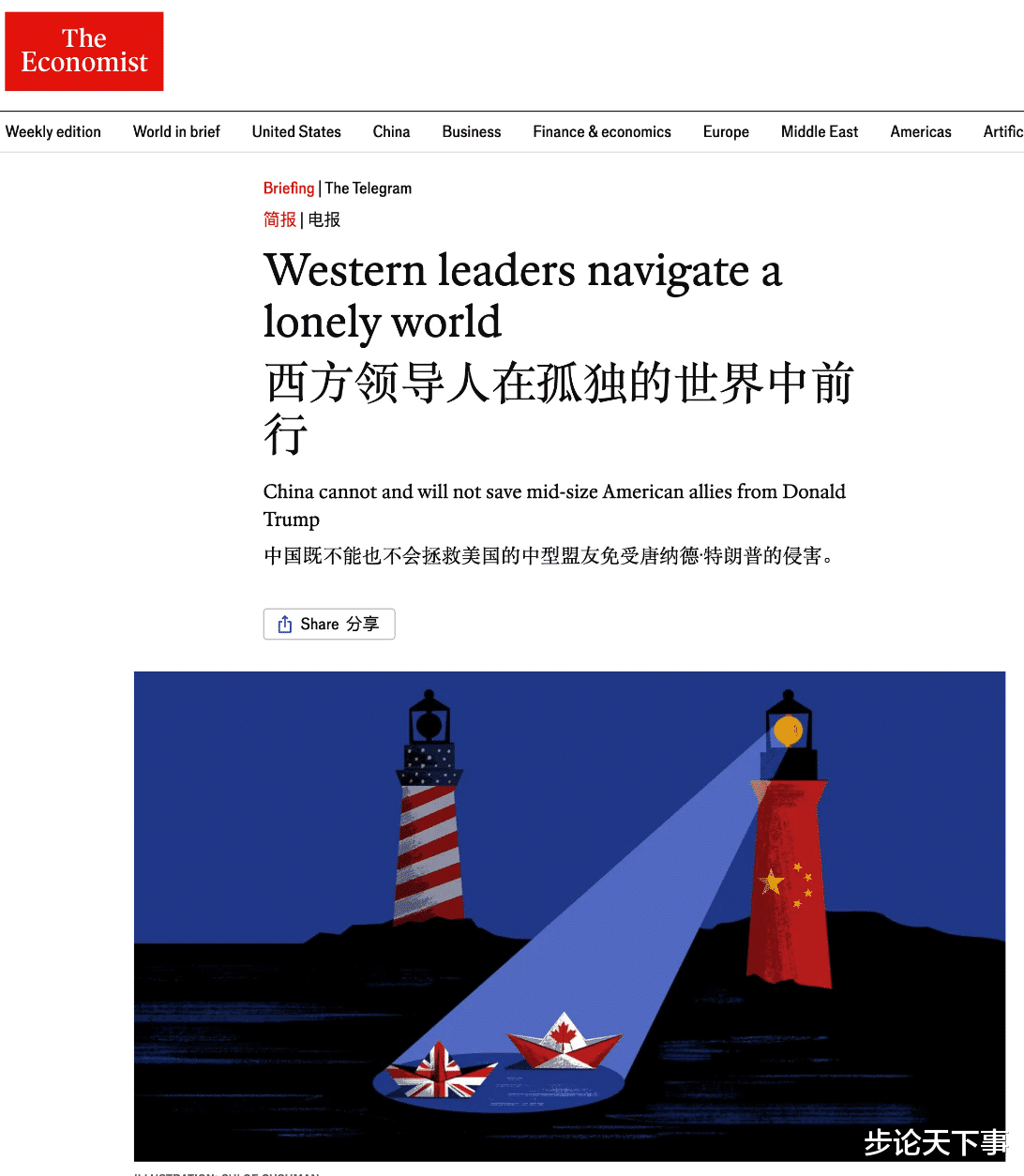 简直不敢相信英国人写的东西,太辣眼睛了——“中国既不能也不会拯救美国的中型盟友免受唐纳德·特朗普的侵害”——这是英国《经济学人》的文章标题。