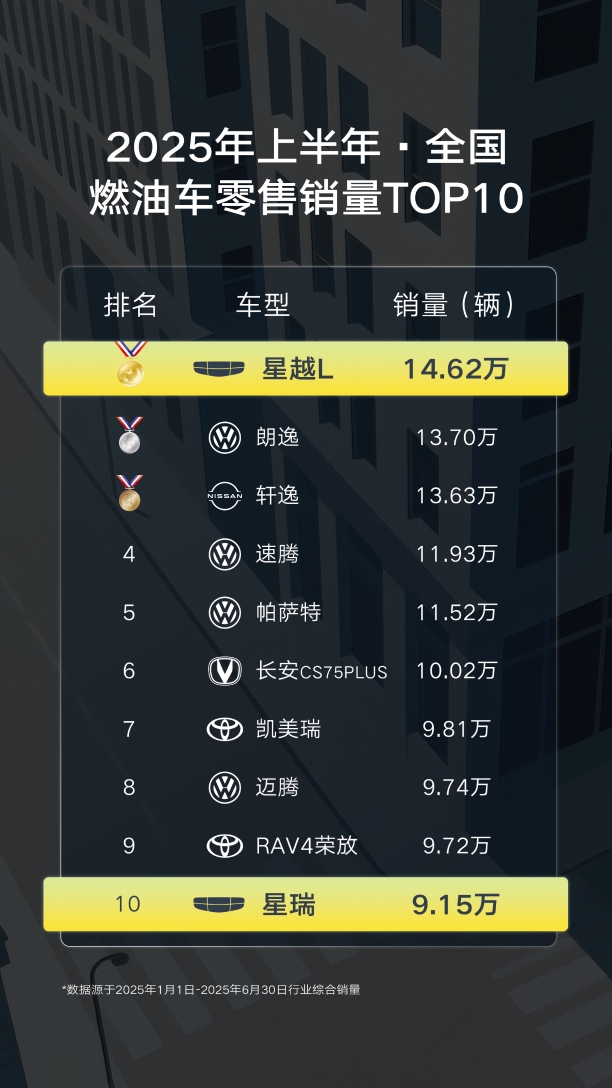 10万买家用车,你是否总在‘安全’与‘舒适’间反复权衡?要大空间怕配置缩水,要高配置又担心安全打折扣——2025年的市场给出了新解法:吉利星瑞以半年91486辆的销量登顶自主燃油轿车销冠,更与兄弟车型星越L(半年14.62万销量登顶全品牌燃油SUV)组成‘吉利双星’,用实力证明:10万级家轿,安全与舒适可以兼得。