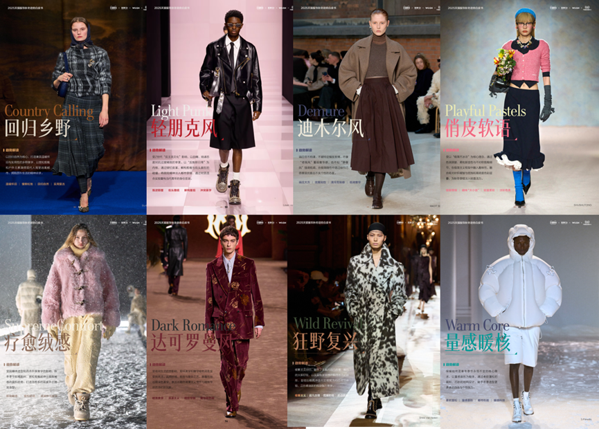 《白皮书》综合社媒讨论趋势、淘内搜索趋势等大数据,从面料创新性、风格热度潜力、场景适用性、消费潜力度、受众覆盖面五大维度,精选了回归乡野、轻朋克、迪木尔、俏皮软语、疗愈绒感、达可罗曼、狂野复兴、量感暖核八大趋势风格,并从“形色质”、场景穿搭、热门单品等方面对不同趋势风格进行了深入解析,以帮助品牌把握潮流趋势。