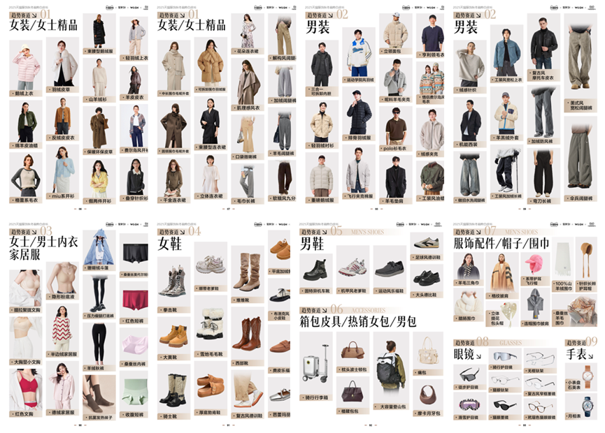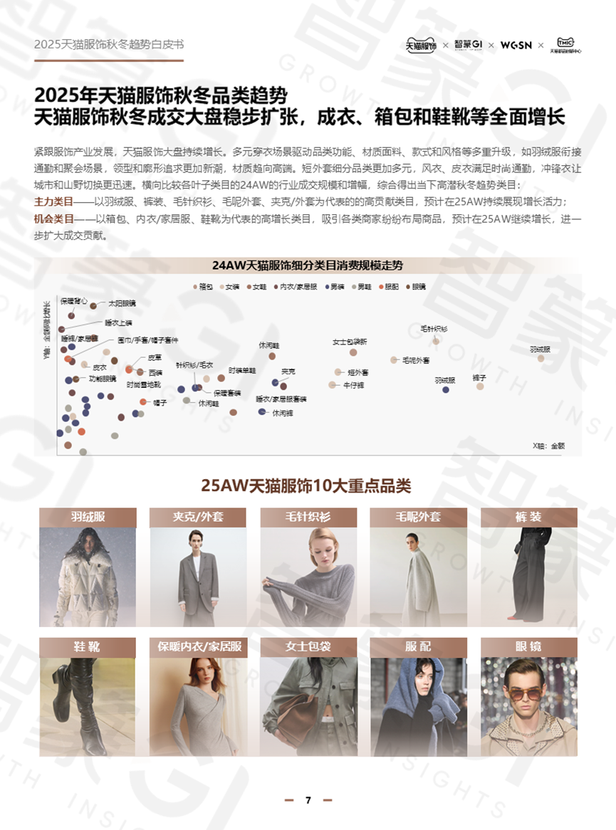 《白皮书》根据各子类目24AW的行业成交规模和增幅,综合得出当下十大高潜秋冬趋势类目:以羽绒服、裤装、毛针织衫、毛呢外套、夹克/外套为代表的的主力类目和以箱包、内衣/家居服、鞋靴、服配、眼镜为代表的机会类目,预计将在25AW持续展现增长活力,扩大成交贡献。