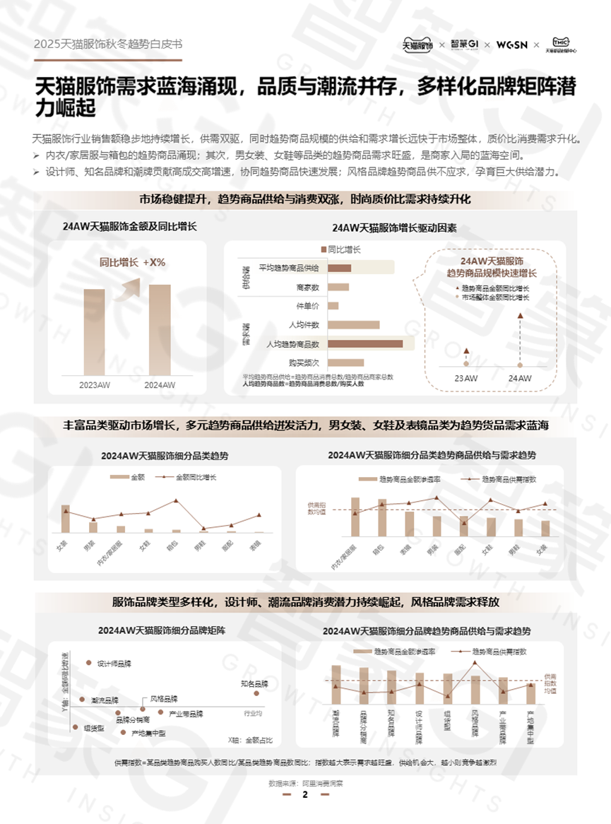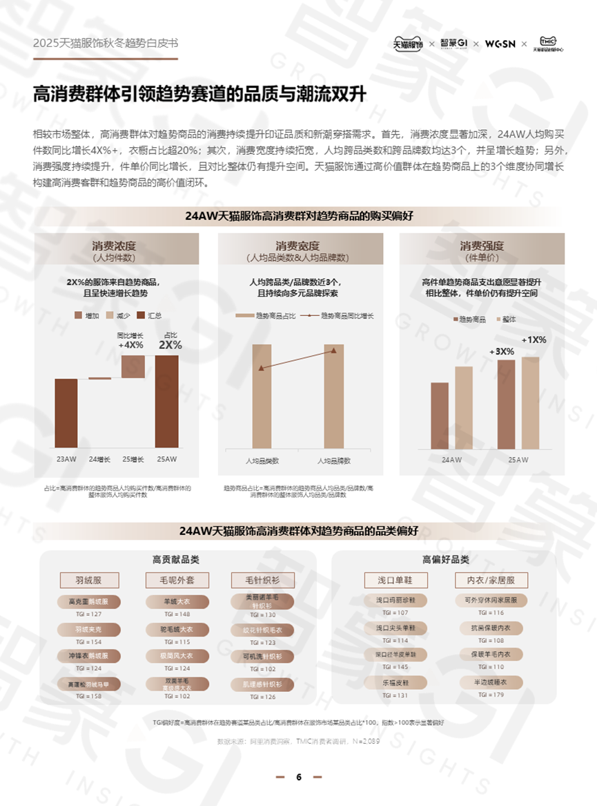 从消费行为看,高消费群体对趋势商品的消费浓度、宽度和强度均快速增长,且仍具备提升空间。24AW人均购买件数同比增长超过40%,衣橱占比超20%,人均跨品类数和跨品牌数均达3个,件单价同比增长,且对比整体仍有提升空间。天猫服饰将依托高价值群体在趋势商品上的3个维度协同增长,构建高消费客群和趋势商品的高价值闭环。
