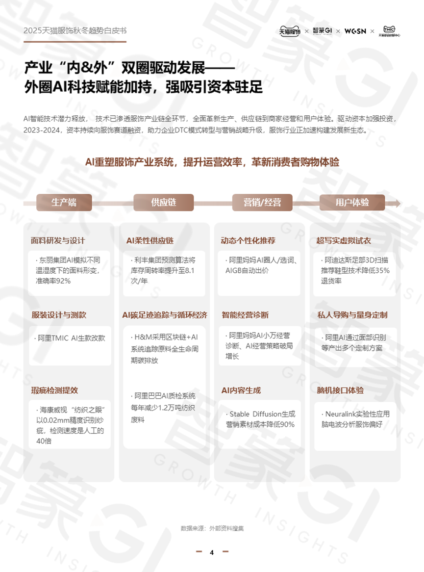 核心趋势,抗寒面料、抗菌面料等技术突破带动品牌营收快速增长,受到年轻消费者追捧;消费端对情绪价值在服饰上的映射需求愈发强烈,大众尝试通过服饰穿搭表达内在情绪与感知。此外,随着AI智能技术潜力释放,驱动资本加强投资,AI科技与资本正成为服饰产业发展的外圈驱动力。