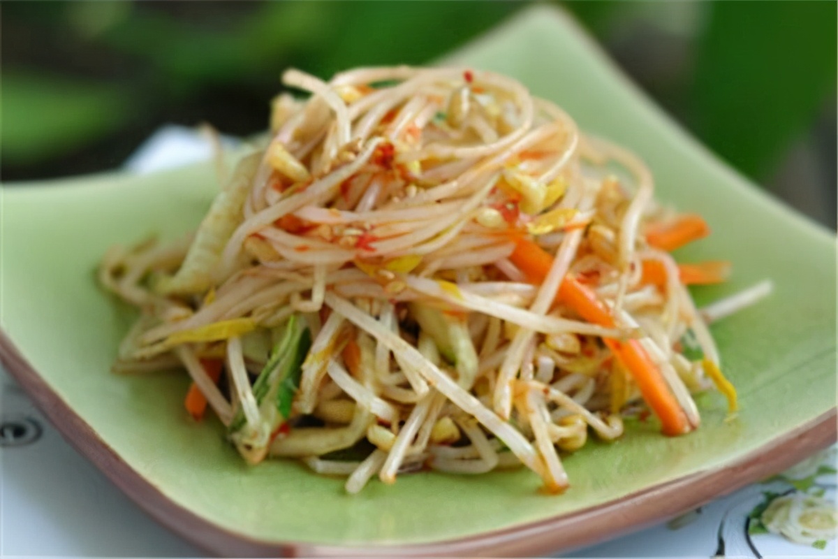 准备食材:主料:黄瓜100克、绿豆芽200克;辅料:蒜、大葱、姜、醋、盐、味精、香油各适量。
