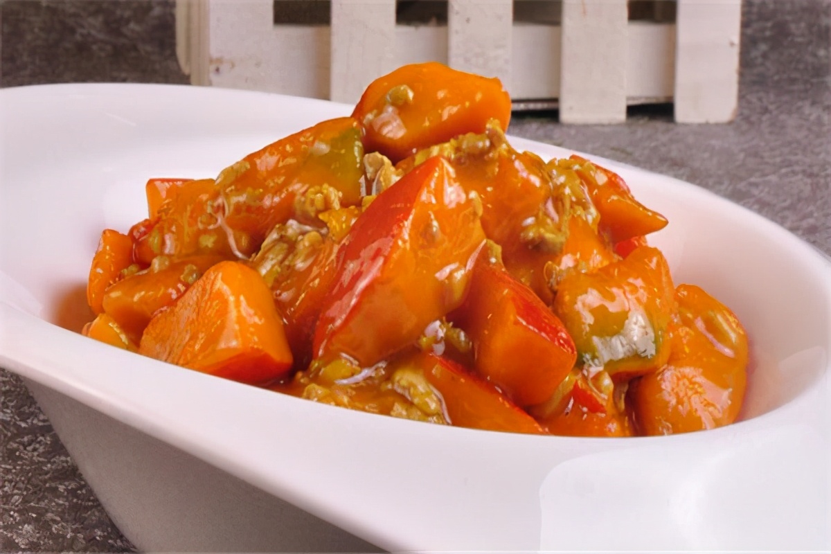 2、用六成热油将南瓜炸熟透捞出,炒锅上火,加油烧热,煸炒肉末,加入主、配料,调味,翻均匀,淋入香油即可食用。