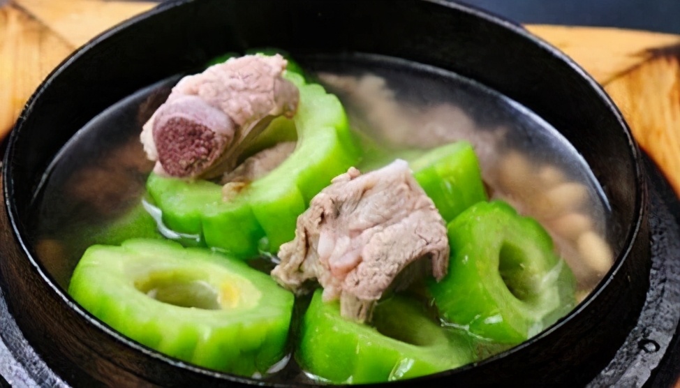 4、把苦瓜瓤去除干净后放入煮开的汤中,用小火进行熬煮。