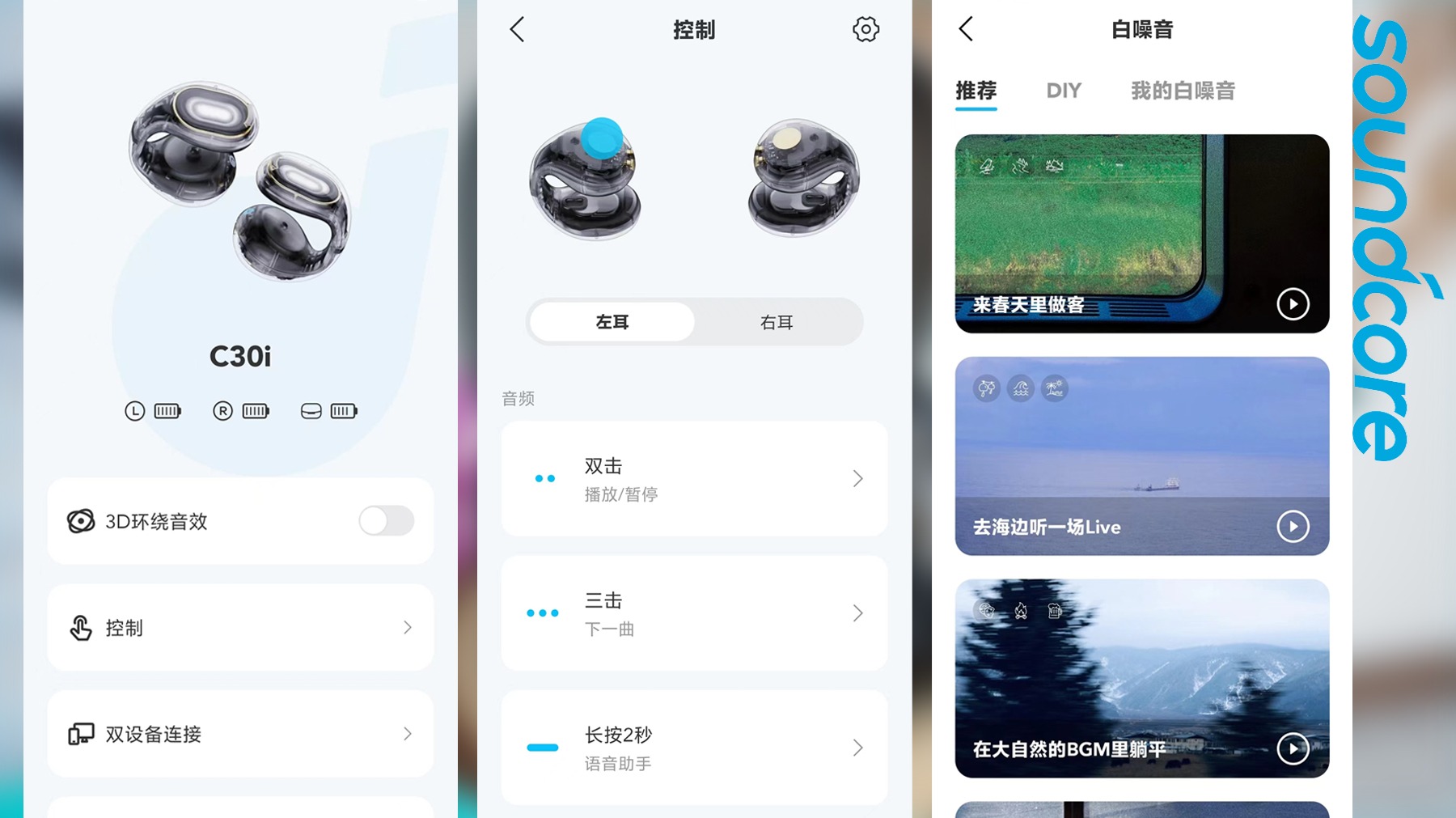 耳机也有配套APP可使用,可以开启3d环绕音效、更改触控操作、双设备连接、升级固件等个性化设置。APP还内置了多款白噪音和正念音疗体验,可以佩戴耳机时倾听,让身体和心灵放个假。