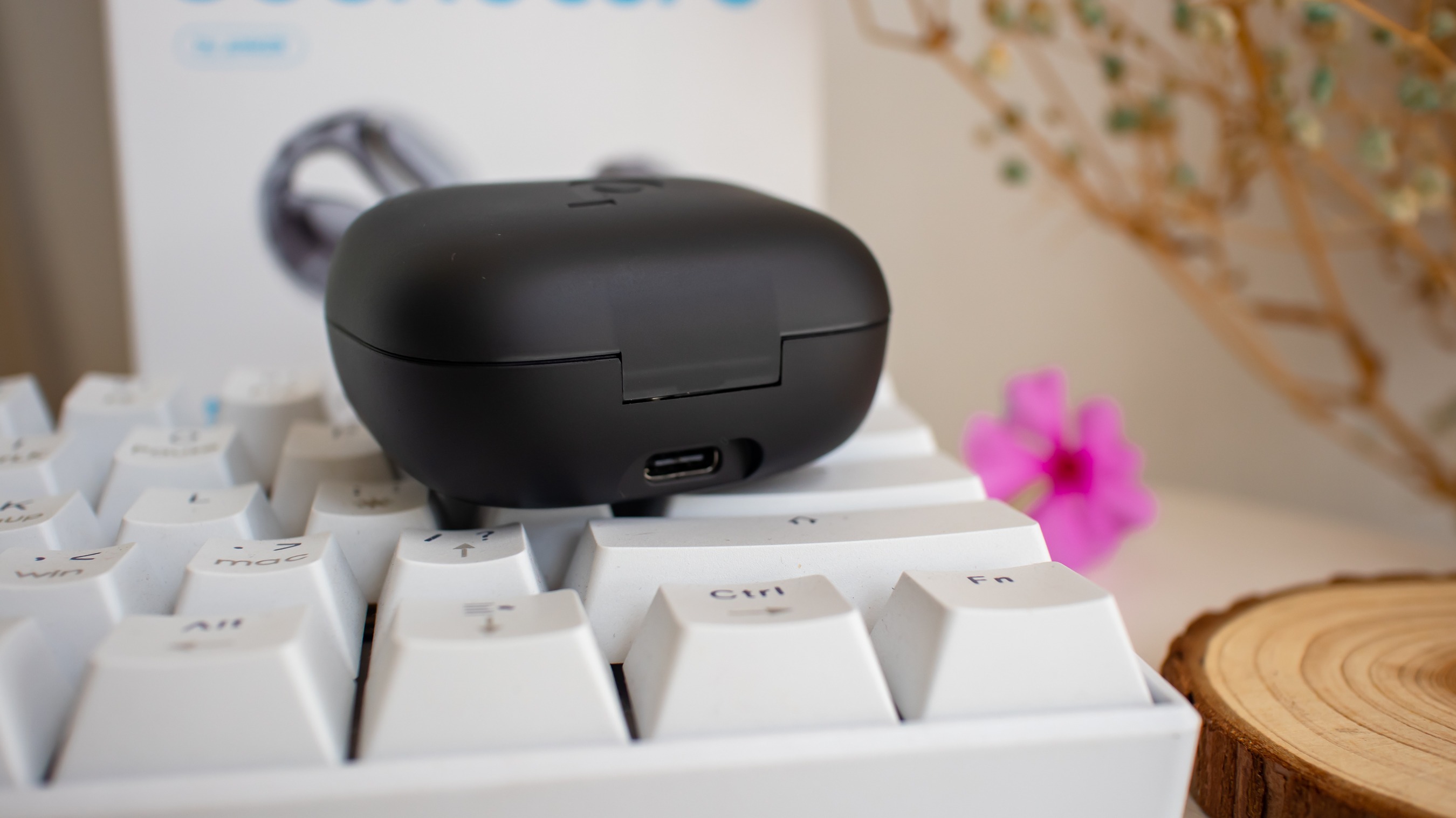 外观方面,声阔C30i太空舱有太空黑、星闪白两款颜色,这次我拿到的这款是太空黑,充电仓盒盖上有声阔的LOGO,上手能感觉到很轻,在手中也不会滑手,缺点就是夏天容易留下指纹。