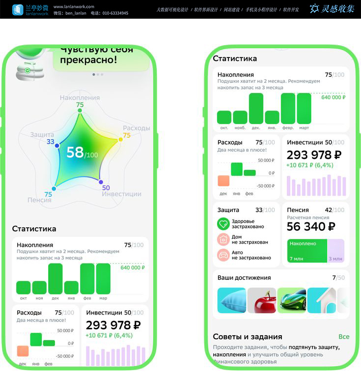 数据可视化的“叙事化设计”是案例的最大亮点。传统理财APP的收益数据多是“数字+表格”,而这组案例将理财进度做成了“雷达图+柱状图的复合可视化”:雷达图展示“资产配置健康度”,用不同颜色的区域区分“储蓄、理财、股票”等资产类型,让用户直观看到自己的资产结构是否合理;柱状图展示“月度收益变化”,蓝色代表“收益”,红色代表“支出”,配合“本月比上月多赚2000元”的文字提示,把抽象的数字转化为“财富增长”的具体感知。