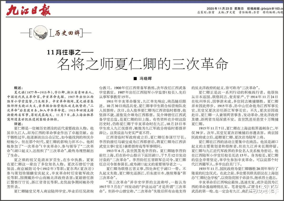 笔者撰写本文,原是在查阅史料时,误以为夏仁卿领导了辛亥革命九江起义。然而,随着进一步发掘,方才确认他实际领导的是南昌起义。
