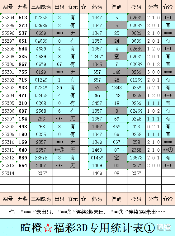 25314期:暄橙福彩3D综合条件(本期将在11月24日21:15开)一、上期回顾 ☆1、上期开奖号:6 6 4。2、和值= 16,跨度= 2。3、组三形态,001路组合。4、热度分布(热:温:冷)3:0:0。二、本期条件 ☆1、三期缺码:12357。2、热:1469,温:08,冷:2357。3、断组分解式:3489//012-567。4、四胆:3579;三胆:579。三、术语解释 ☆1、三期缺码:0至9这十个自然数当中,未在近三期开奖号出现的数字。2、热度(热温冷):自然数0至9,在近七期开奖号中,出现3次及3次以上的数字,称为热码;出现2次的数字,称为温码;出现1次和未出现的数字,称为冷码。某个数字在开奖号中出现几个,就按几次计算。3、断组分解式:将0至9这十个自然数,分成三组数字,从前往后依次为A组(4码)、B组(3码)、C组(3码),一般情况下,有一组数字不出码,偶尔会有两组数字不出码。A组不出码的情况相对较少。断组为主,分解为辅。4、常态组六号码:同时包含大数、小数、奇数、偶数、质数、合数的组六号码,共有72注。统计表中,简称“常态”。5、非常态组六号码:全大数、全小数、全奇数、全偶数、全质数、全合数等六种形态的组六号码,共有48注。统计表中,简称“非常”。★提醒:彩市有风险,参与须谨慎!理性购彩,量力而行!多看少买,不要痴迷!任何条件都有出错的时候!水平有限,仅供参考!友好互动,好运相伴!