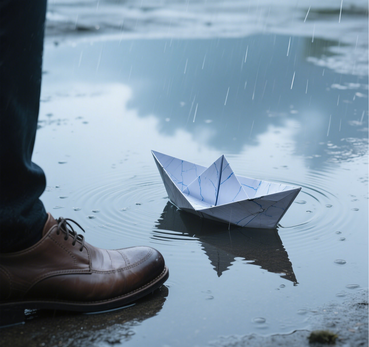 《折纸雨季》水洼中漂浮着船身破损进水的纸船残骸,纸船上的折痕被雨水晕开成蓝色纹路,天空中下着透明的雨,雨滴在地面溅起圆形