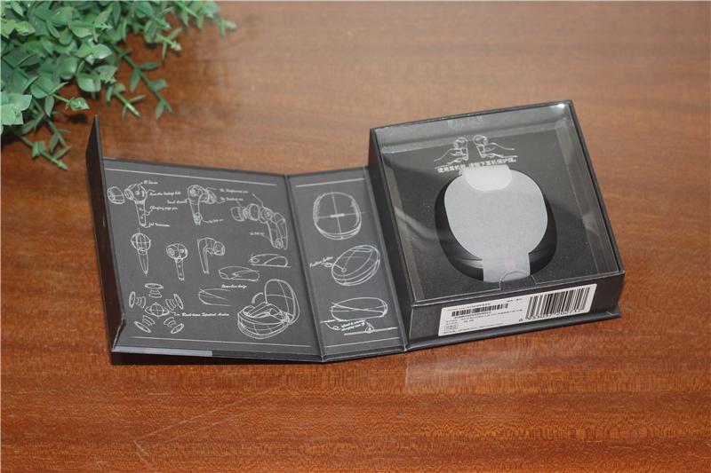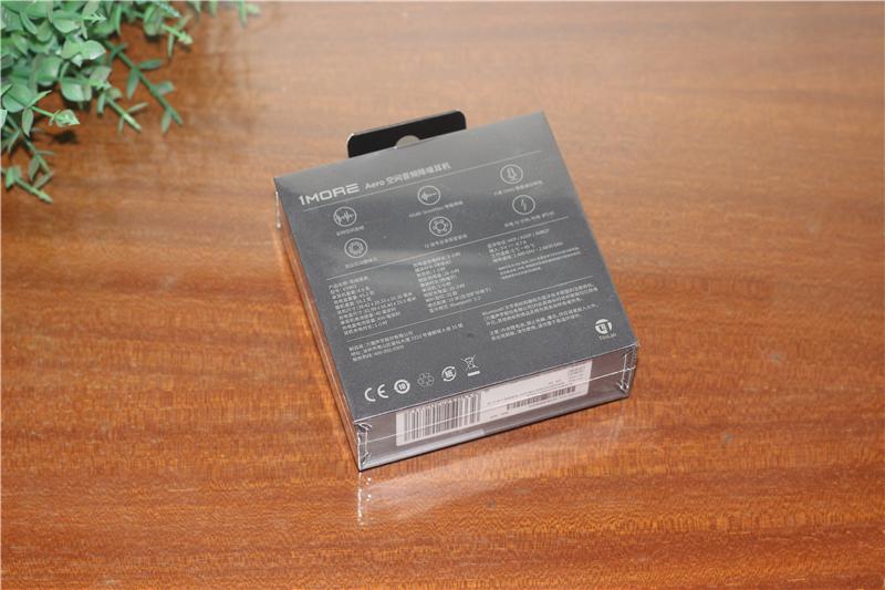 1MORE Aero的包装采用翻盖打开的设计,黑色与深灰的搭配,包装盒正面右侧印有产品的图片,左侧耳机型号与1MORE LOGO,背面是主要卖点、耳机参数信息的介绍,该耳机有两款可选,白色和黑色两种,从包装图片可以看出我的这款是黑色。