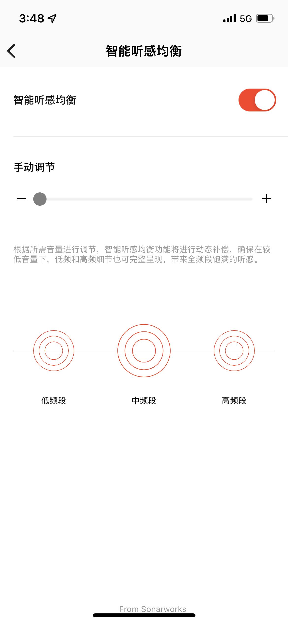 1MORE Aero另一个特色技术:智能听感均衡,智能听感均衡就是对不同音量下不同频率的声音进行优化,主要是针对低音量的补偿比较多,同样需要在APP中开启,在APP的默认值,正常音量下听不出有什么特别之处,当手动调大幅度,低频明显加强,乐器表现突出。