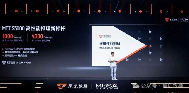 在推理端,单卡性能逼近国际水平。在DeepSeek-V3 671B满血版大模型的推理中,摩尔线程携手硅基流动,基于S5000单卡跑出了惊人的成绩:Prefill吞吐量突破4000 tokens/s,达H100同场景的61%以上;Decode超过1000 tokens/s。这一性能突破得益于S5000对FP8精度的原生支持,以及MUSA架构中ACE引擎对通信任务的卸载。对于算力基础设施建设商而言,这意味着无需依赖海外芯片,利用国产芯片,即可实现高性能、低成本的大模型部署。