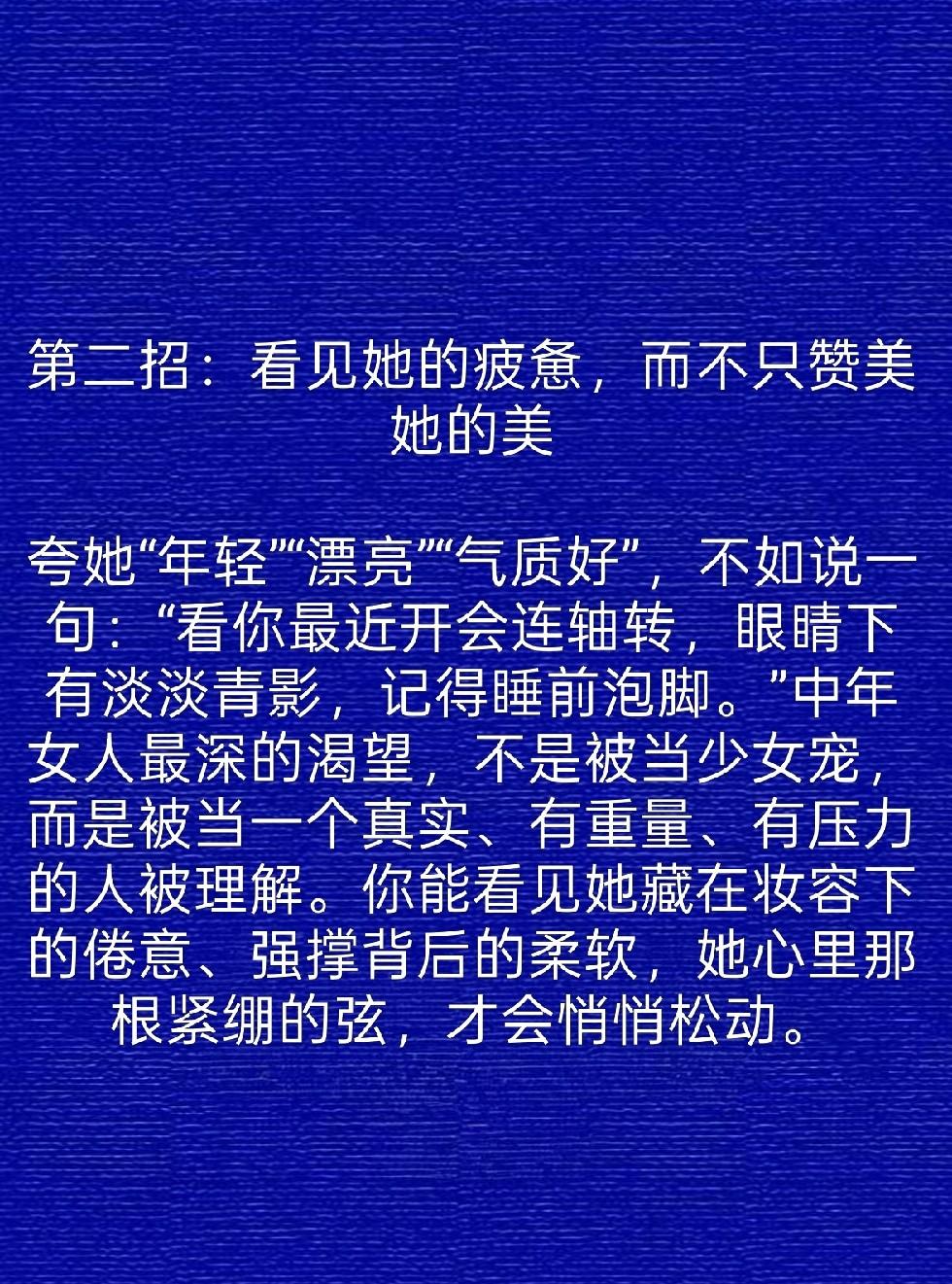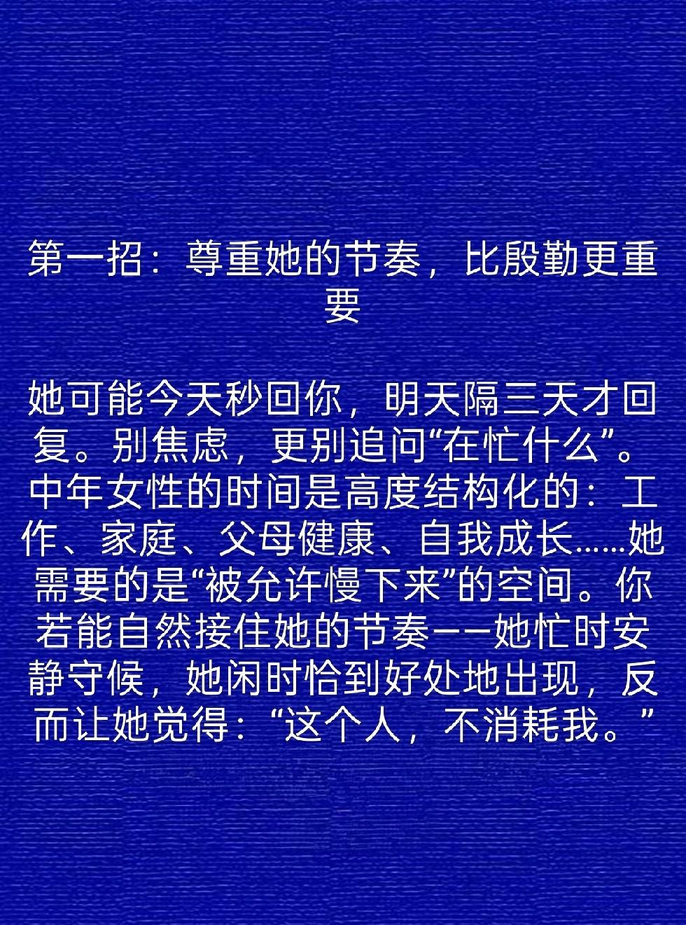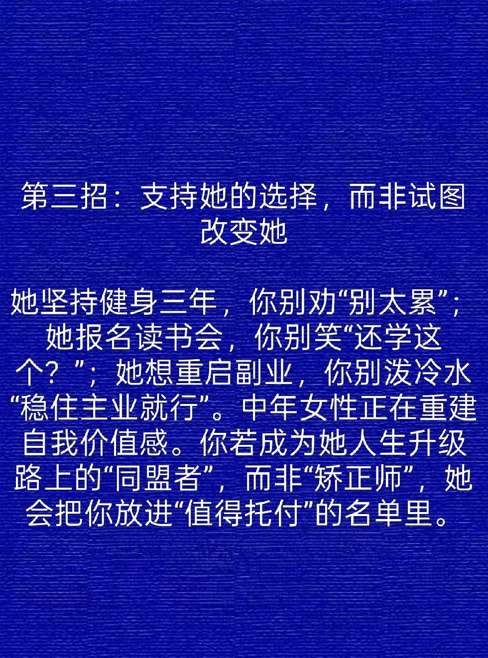 还有个点,别试图改造她,别上来就说你该你不该,她该怎么穿,她该怎么花,你真在乎,就尊重她的生活秩序,她的工作节奏,她的朋友圈子,你提供支持,不是发布命令,你给选择,不是收缴自由。