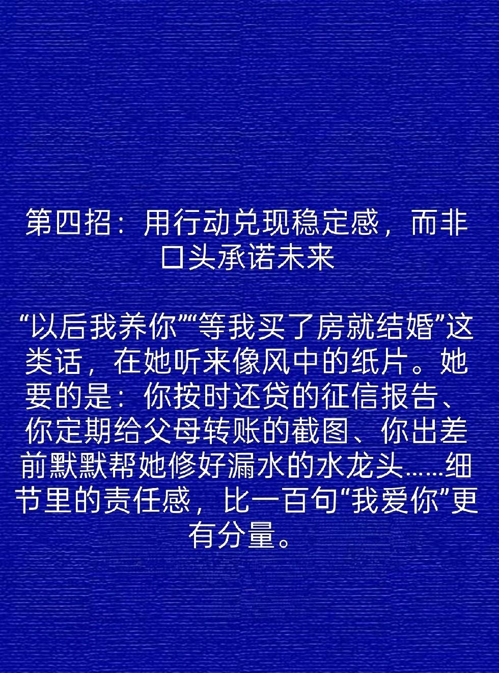 她要的安全感,不是定位共享,不是随叫随到,是你有边界,有自控,有节奏,有担当,是你情绪自己消化,不把垃圾往她身上倒,是你事发就处理,不把锅留到明天,这要求高吗,不高,只是成年人基本盘。