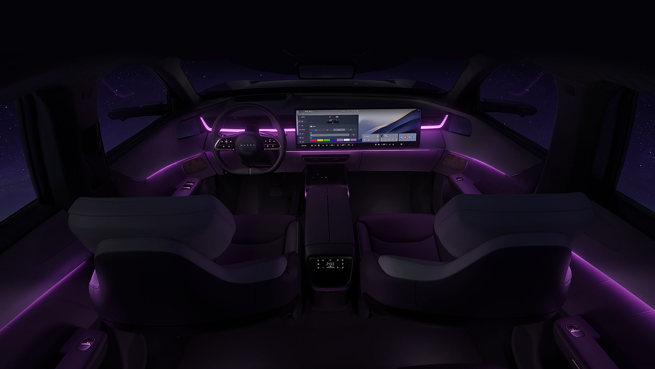 而环顾车内,可以看到马自达EZ-60的车内空间也一改马自达传统的弱势部分,该车的车身长度为4850mm,车宽1935mm,车高1620mm,轴距2902mm,定位一款中型SUV。尤其像是车内的后排空间表现,其膝部空间122mm,伸腿空间990mm,即使是身高188cm的乘客坐在车内后排也能轻松翘起二郎腿。