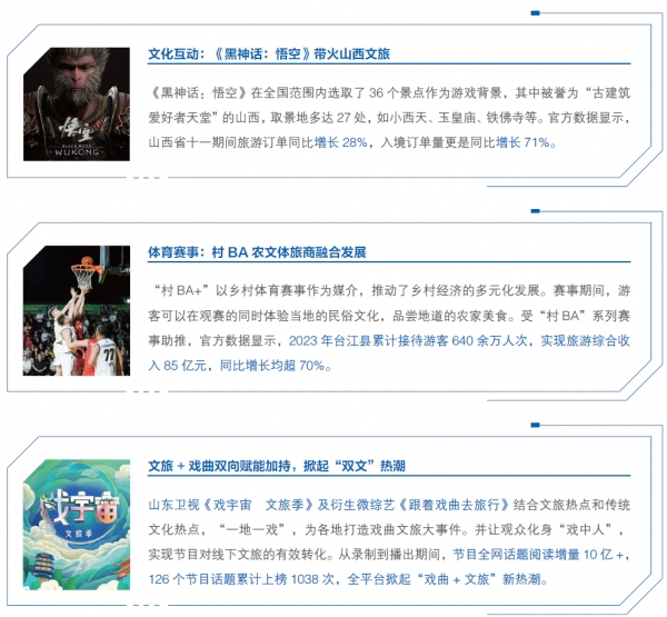 文旅融合通过剧综纪录片IP 打造、科技赋能创新体验形式、挖掘地域文化等方式,满足了消费者的多元化需求,为新型消费的发展提供了强大动力。
