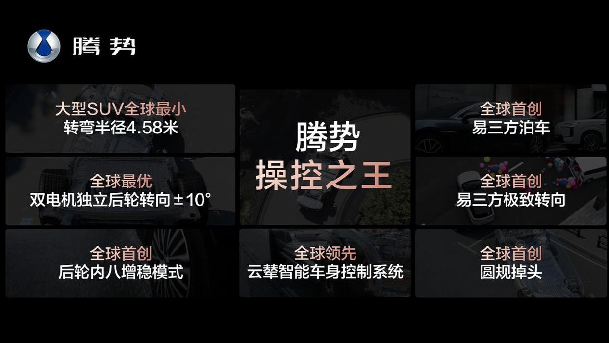 操控上,腾势N8L也有不俗的实力。全系标配“插混专用2.0T高效发动机+三电机”动力组合,零百加速仅需3.9秒;后轮双电机独立转向技术,让这台5.2米的大型SUV拥有4.58米同级最小转弯半径,灵活度堪比A0级小车。再搭配35.4米优异刹车距离和云辇-A智能空气车身控制系统,把豪华、安全与驾控完美的融合。