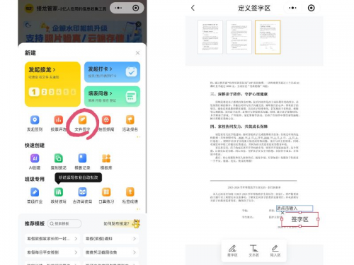 第一步,打开“接龙管家”小程序,选择「文件签字」,上传寒假致家长的一封信+回执单,支持PDF、Word、图片3种格式。