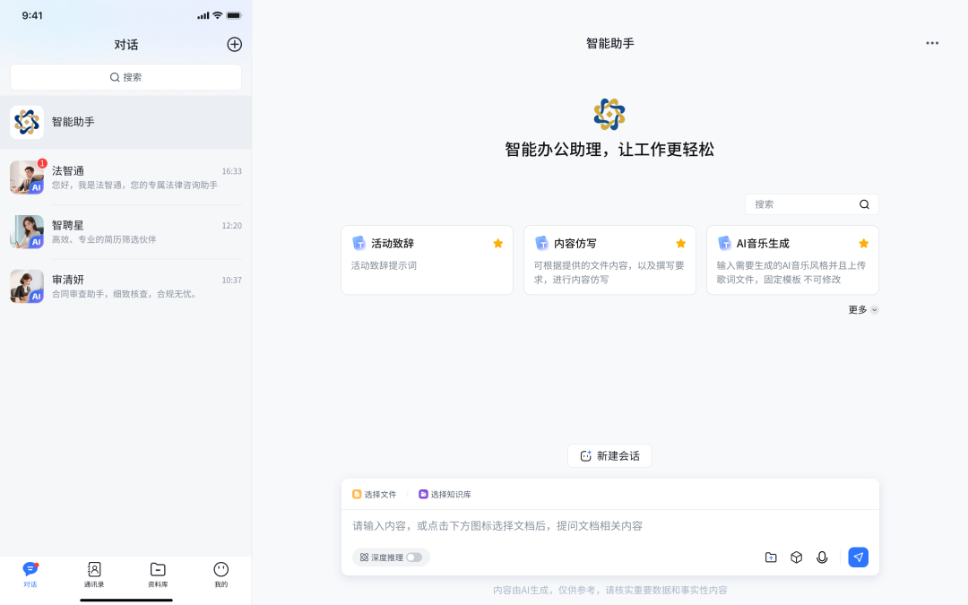智能问答:告别无效检索:上传文档、图片、音视频等 40 多种格式文件,提问即可快速获取精准答案;预设会议纪要、公文撰写等高频场景模板,一键生成规范内容,新手也能快速上手。