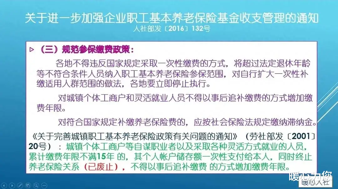 灵活就业养老保险的补缴政策。灵活就业人员是一种自己承担社会保险费参加养老保险的一种群体。过去的时候,我们的养老保险缴费政策放的比较宽,一些地方确实也存在养老保险补缴的情况。不过,等到了2016年,人社部发布了《关于进一步加强企业职工基本养老保险基金收支管理的通知》,明确灵活就业人员和城镇个体工商户不得以事后追补缴费的方式增加缴费年限。