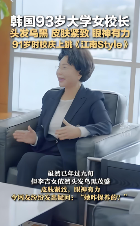 韩国嘉泉大学校长李吉女(이길여)近期因宣传片引发热议。93岁的她满头乌发、腰板笔挺,皮肤紧致无明显皱纹,眼神锐利如炬,甚至能轻松穿高跟鞋爬楼梯。更令人惊叹的是,91岁时她曾在校庆大跳《江南Style》热舞,活力四射远超同龄人。面对网友追问保养秘笈,她仅轻描淡写:“多喝水、不烟酒、少喝咖啡。”医学检查更显示其身体状态仅相当于60余岁,秘诀被归结为高度自律的生活习惯+天然骨相优势,但她直言:“医美激光和发型打理也是锦上添花。”