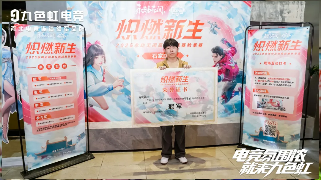 恭喜赵效翰选手夺得冠军!此次赛事的成功举办,再次印证了九色虹电竞在推动高校电竞发展方面的不懈努力。我们始终致力于为高校学子提供专业的竞技平台,让"电竞氛围浓,就来九色虹"的品牌理念深入人心。