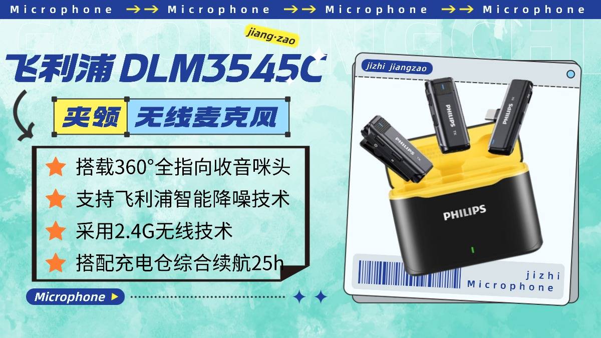 飞利浦智能降噪技术有效压制低频杂音,室内安静环境下收音纯净度高(户外复杂杂音应对能力有限,不建议户外使用);50米内无线传输稳定,支持一拖二设计,适配多人室内拍摄;搭配充电仓综合续航25小时,满足日常创作需求,性价比突出。