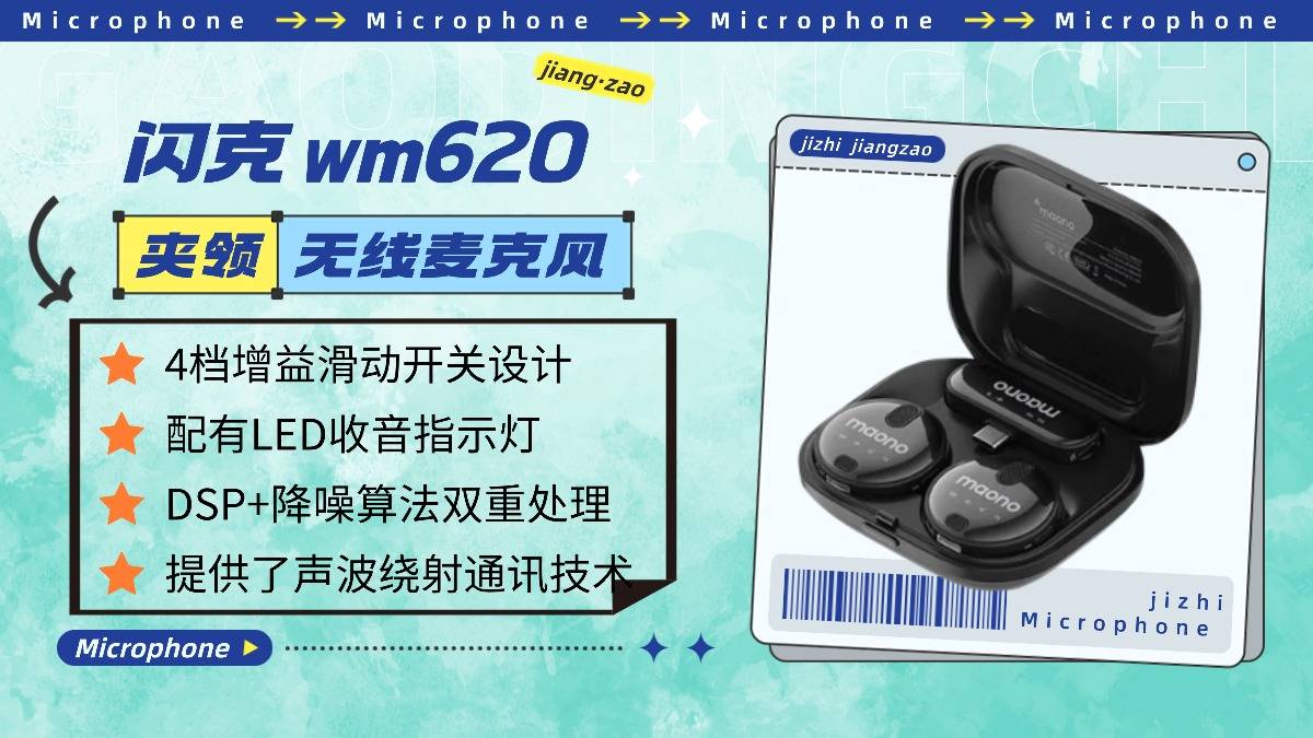 闪克作为音频领域老牌选手,wm620更适合有轻度双人创作需求的新手。ENC降噪算法+DSP芯片双重加持,有效削弱环境干扰,室内录制人声清晰无明显杂音,但是室外高频杂音过滤效果一般。