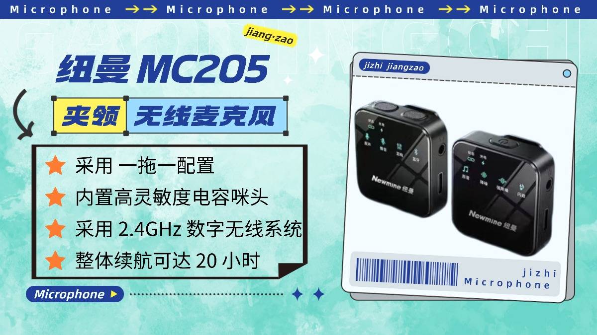 纽曼MC205是入门级“性价比黑马”,采用全指向性设计+高灵敏度电容咪头,满足基础创作收音需求。拥有智能芯片搭配强降噪技术,室内环境下压制轻微背景杂音,几乎无电流声;2.4GHz数字无线系统实现100米内无遮挡稳定传输。