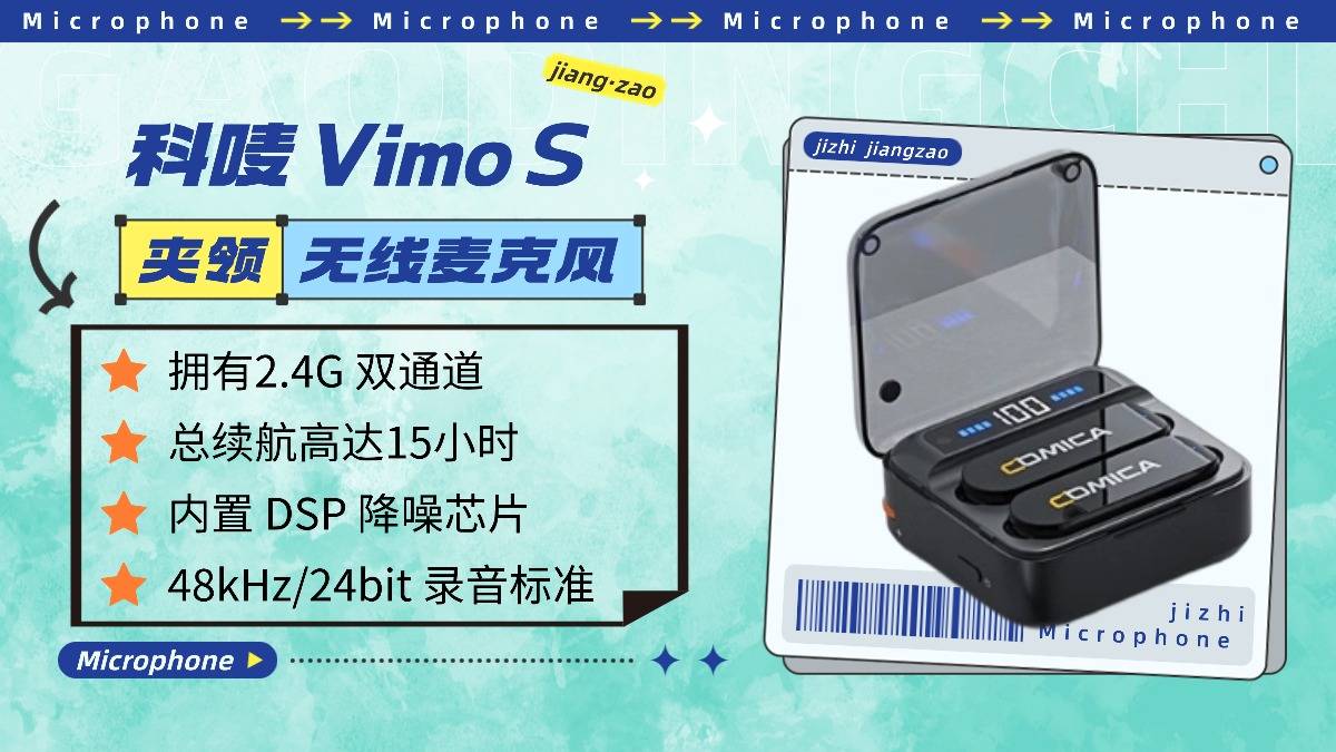 科唛这个 Vimo S 的重心更加集中在轻量化设计与易用性上。单麦仅 10g 的超轻重量,长时间夹在衣领上也无坠拉感,佩戴毫无负担;多功能磁吸充电仓自带智能数显功能,剩余电量直观可见,不用猜测续航状态。全指向性拾音设计覆盖范围广,48kHz 专业采样率保障基础音质清晰,日常拍 Vlog、录口播等轻度创作完全能满足。