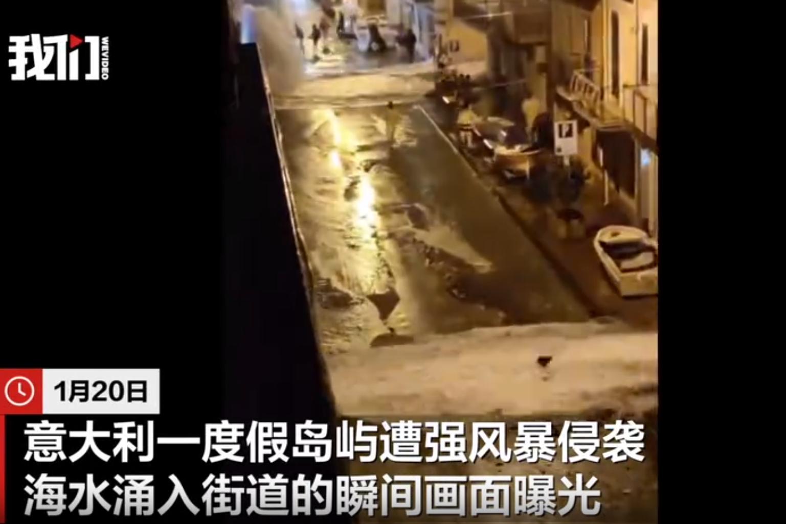 1月20日,意大利一度假岛屿遭强风暴侵袭,海水涌入街道的画面曝光。