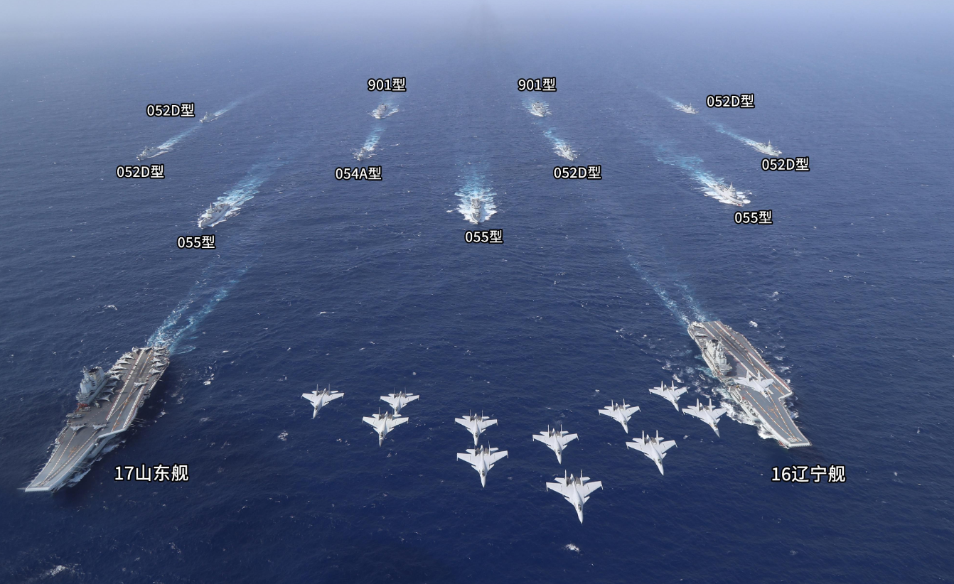 10月31日,中国海军辽宁号和山东号这两艘航母组成庞大的海上编队,其他成员有11艘055型万吨大驱、052D型防空驱逐舰、054A型导弹护卫舰和901型综合补给舰,在南海某海域进行大规模演习的视频和图片,在全球互联网上疯狂传播。