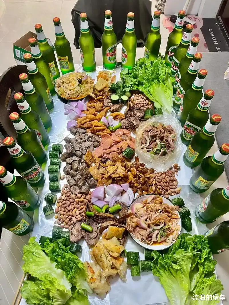 接下来这一桌一看就是东北人的年轻人年夜饭,一大桌的大绿棒子,各种熟食香肠,花生米,还有拌的凉菜,鸡架,这些都是东北人的标配,最让人注意的是,就是那一桌的青菜和黄瓜,吃点肉,喝点酒,吃点青菜,享受又健康,好像只有东北人喝酒吃肉的时候,爱吃洋葱和大蒜吧