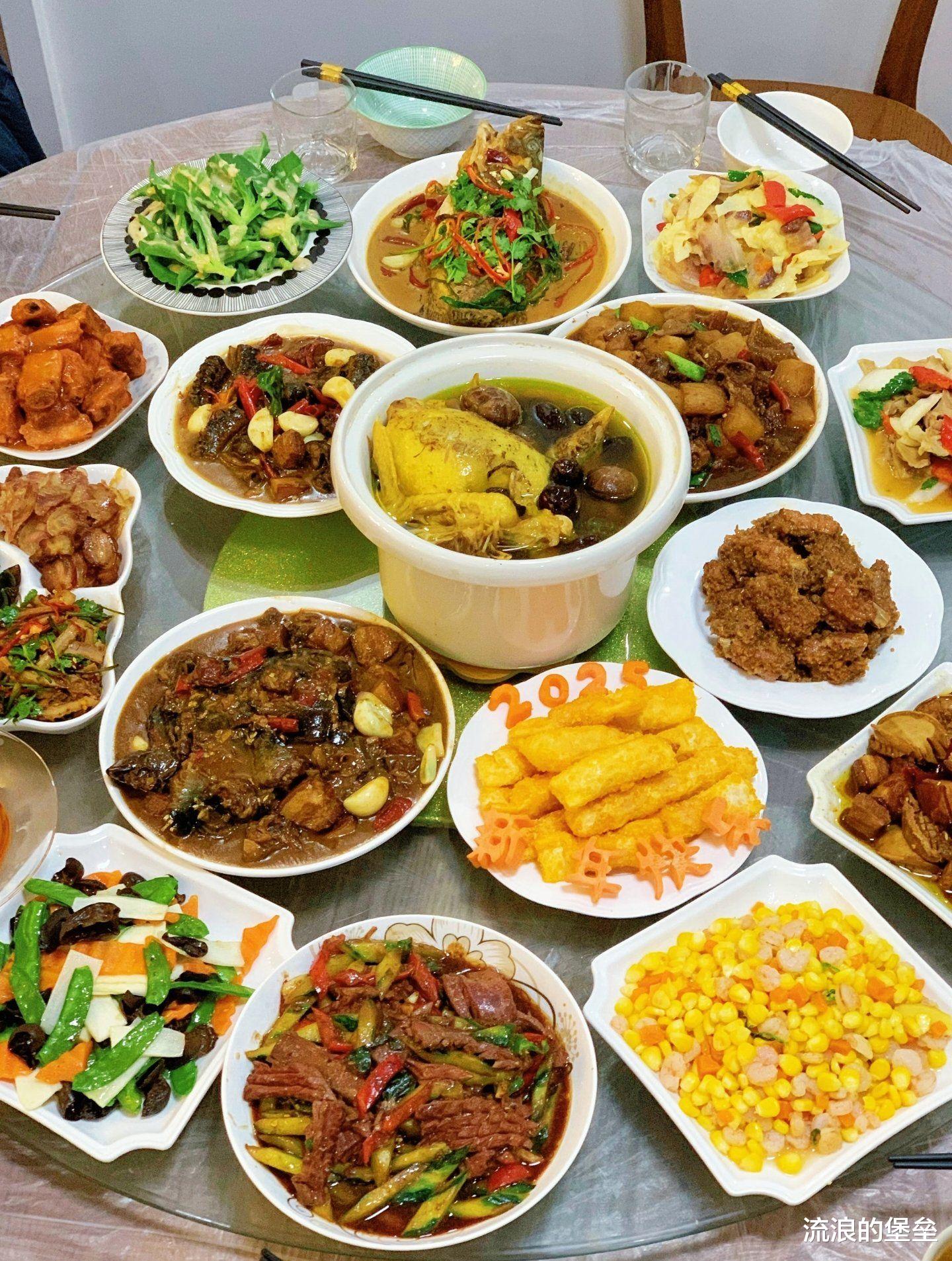 这一桌年夜饭一看就是家长做的,有鸡有鱼有排骨,而且还有汤,小炒的青菜,还有牛肉土豆,看起来满满的食欲,冷菜热菜都有,还有甜食,一桌年夜饭简直不要太幸福。