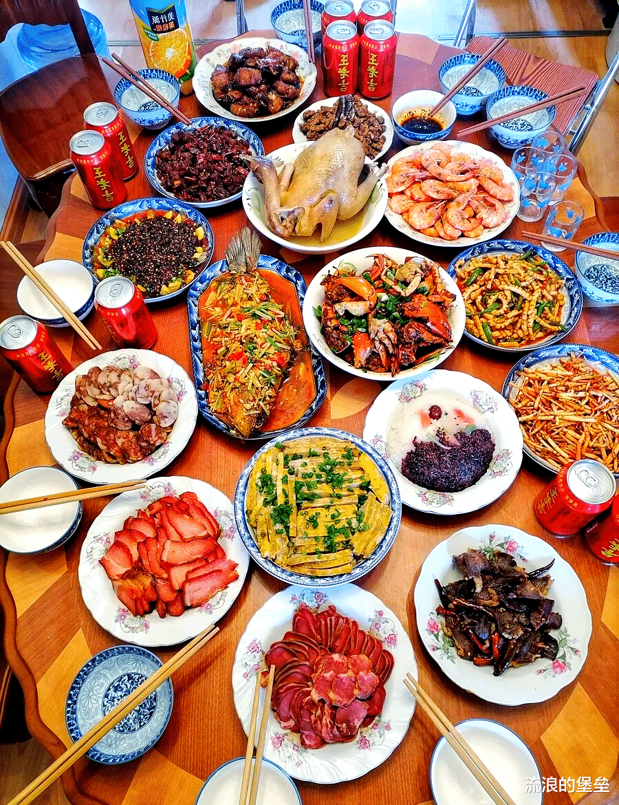 这一桌是经典的年夜饭,每年都要有的鱼,还有鸡,这都是传统的年夜饭美食,从老一辈流传下来的,大虾,螃蟹这几年也常上餐桌,年夜饭都少不了他们,过年吃的大鱼大肉也确实要用凉茶,降火。