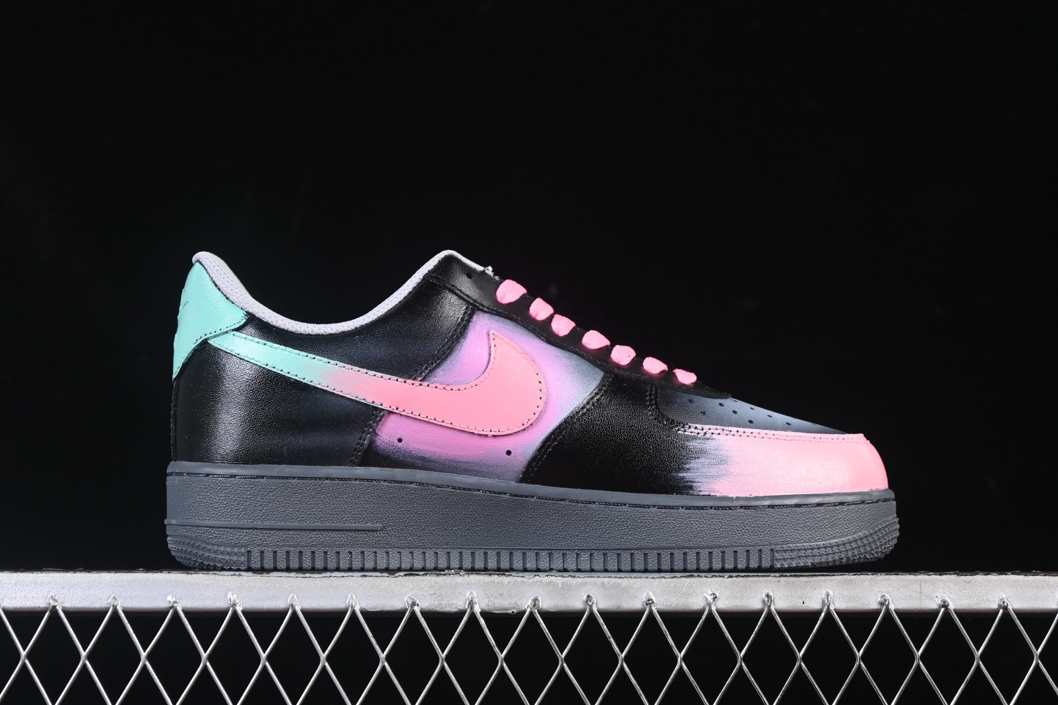 Nike Air Force 1 Pink Electric Spider Shadow 手绘涂鸦 粉电蛛影 空军一号低帮休闲板鞋 粉嫩的Swoosh与蛛网图案交缠,似是蜘蛛侠宇宙里迸发出的霓虹脉络,黑色鞋身点缀的闪电符号、神秘蛛眼,又为其注入几分街头的酷感张力。鞋头渐变的粉紫、中底泼墨般的彩点,在灰调基底上晕染出艺术感,每一处细节都像是潮酷青年的自我宣言——既怀揣着对英雄世界的绮梦,又绝不妥协于平庸的街头风格。