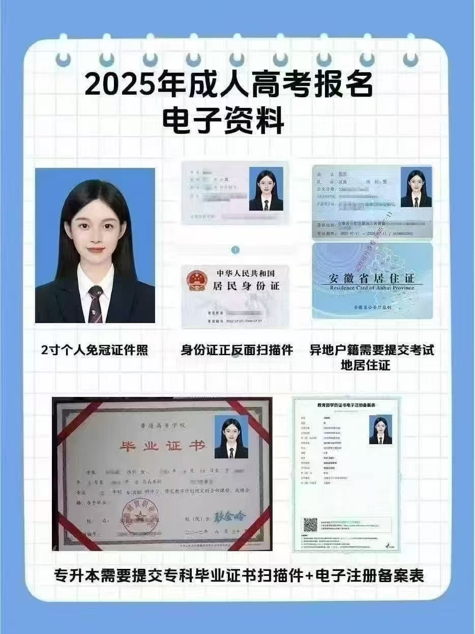 上传材料:身份证原件照片、专升本考生需上传专科毕业证或学信网《教育部学历证书电子注册备案表》、外地考生需上传安徽省居住证或近3个月社保/个税缴纳证明。