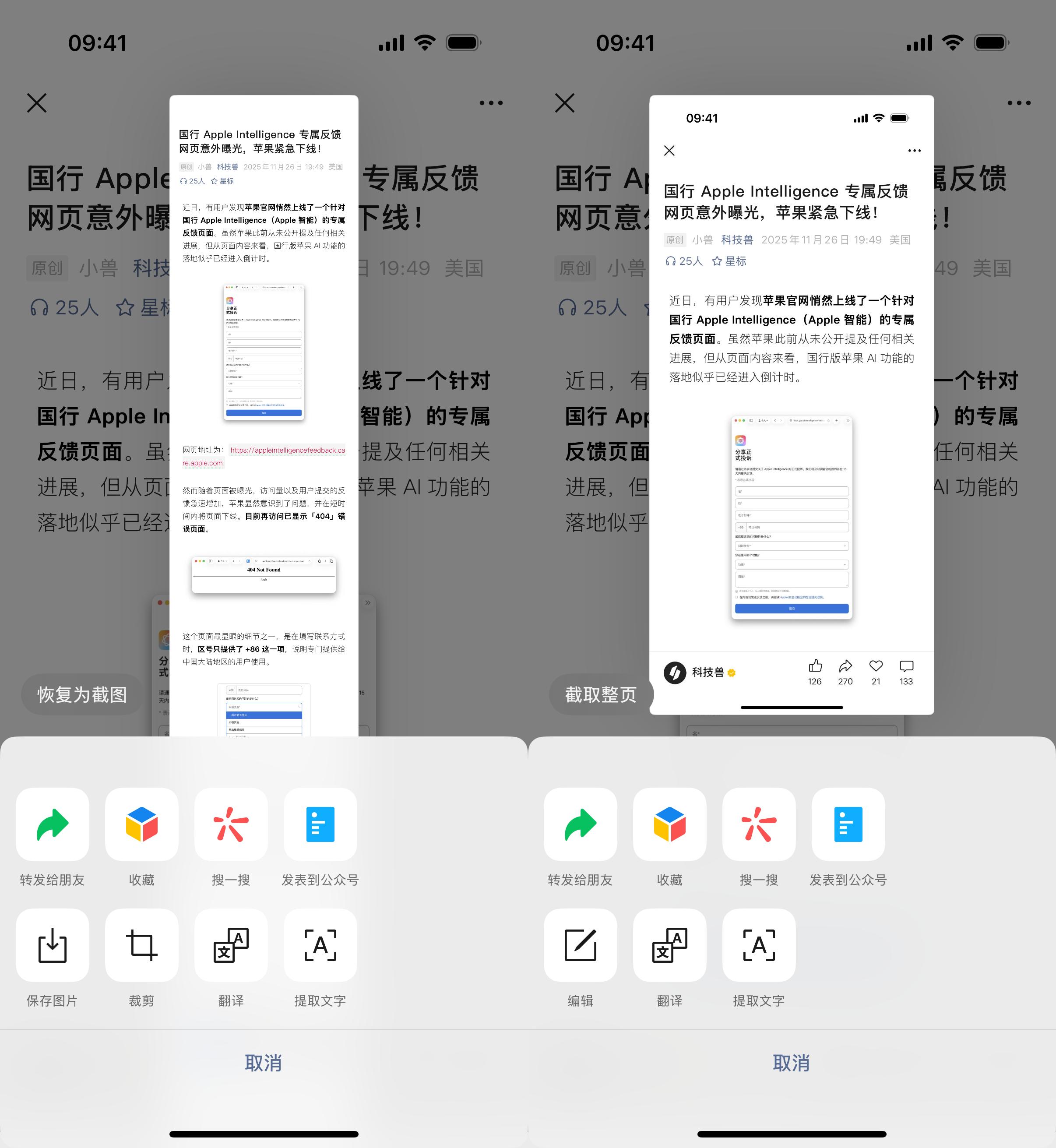 比如在阅读公众号文章时截屏,原来的“保存为整页图片”按钮被调整为「转发截图」,可以快速把截图发给好友,无需再手动发送。