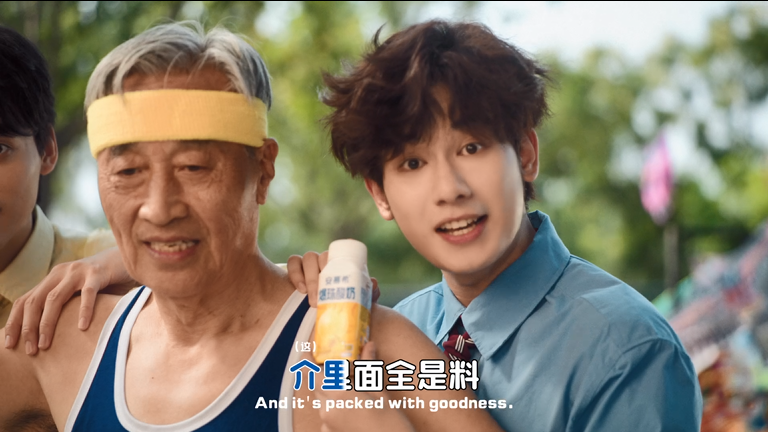 拿起安慕希黄桃燕麦爆珠酸奶时,笑着说 “伯伯倍有料,这里边全是料,好喝,还好嚼,爆珠嘴里跳”。倍有料既夸了大爷的“十八般武艺”,又暗指酸奶里的爆珠、黄桃和燕麦,用幽默的演绎具象化了安慕希黄桃燕麦爆珠酸奶每一口都好喝到爆的味觉体验和快乐属性,这种自带喜剧效果的植入,很容易让观众在笑声中接受安利。