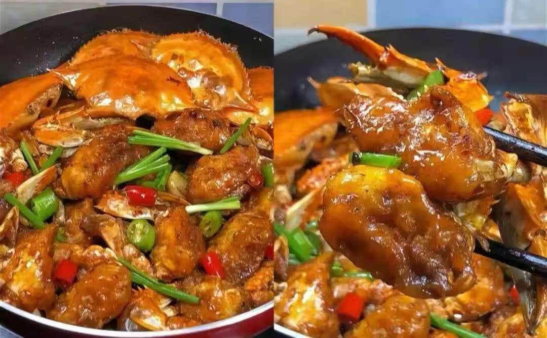 先准备几只活蹦乱跳的螃蟹,把它们放在清水里养一会儿,让它们吐吐泥沙。然后拿起刷子,把螃蟹的外壳、蟹脚都仔细地刷洗干净,尤其是蟹钳和蟹脐这些容易藏污纳垢的地方,可不能马虎。刷好后,把螃蟹的蟹脐去掉,揭开蟹盖,去掉蟹胃、蟹心和蟹腮这些不能吃的部位,再把螃蟹切成两半或者四半,这样更方便入味。接下来准备配料,姜切成片,蒜切成末,葱切成段,干辣椒剪成段,再准备一些花椒和八角。调个酱汁,取一个碗,往里面加2勺生抽、1勺蚝油、1勺料酒、半勺白糖和少许盐,搅拌均匀备用。锅里多倒一些油,油热后把螃蟹块放进去炸一下,炸到螃蟹变色,外壳变得酥脆,捞出来沥干油备用。锅里留少许底油,放入姜片、蒜末、干辣椒段、花椒和八角,小火炒出香味,再把炸好的螃蟹放进去,翻炒均匀。接着把调好的酱汁倒进去,继续翻炒,让每一块螃蟹都裹满酱汁。最后加入一小碗清水,盖上锅盖,小火焖煮几分钟,让螃蟹充分吸收酱汁的味道。等汤汁变得浓稠,撒上葱段,翻炒均匀就可以出锅啦!