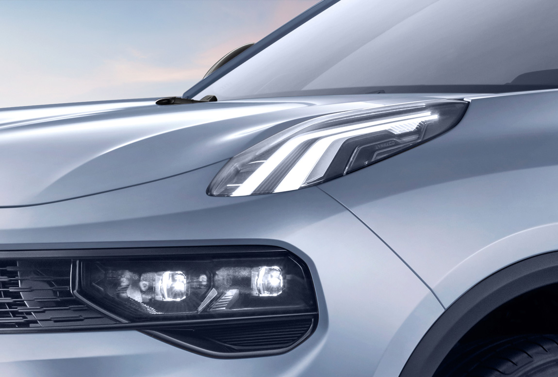 焕新版领克01在外观设计上依旧延续了其家族式外观设计理念,整体的设计以时尚和运动感为主,像其前脸部分的标志性分体式LED日间行车灯有着不错的辨识度,同时中间位置贯穿式的黑色格栅内置了大灯组,同时也起到了很强的视觉效果,而前脸下方则是设计了梯形黑色进气口和导流槽,进而一眼看去整个前脸部分很显运动感。