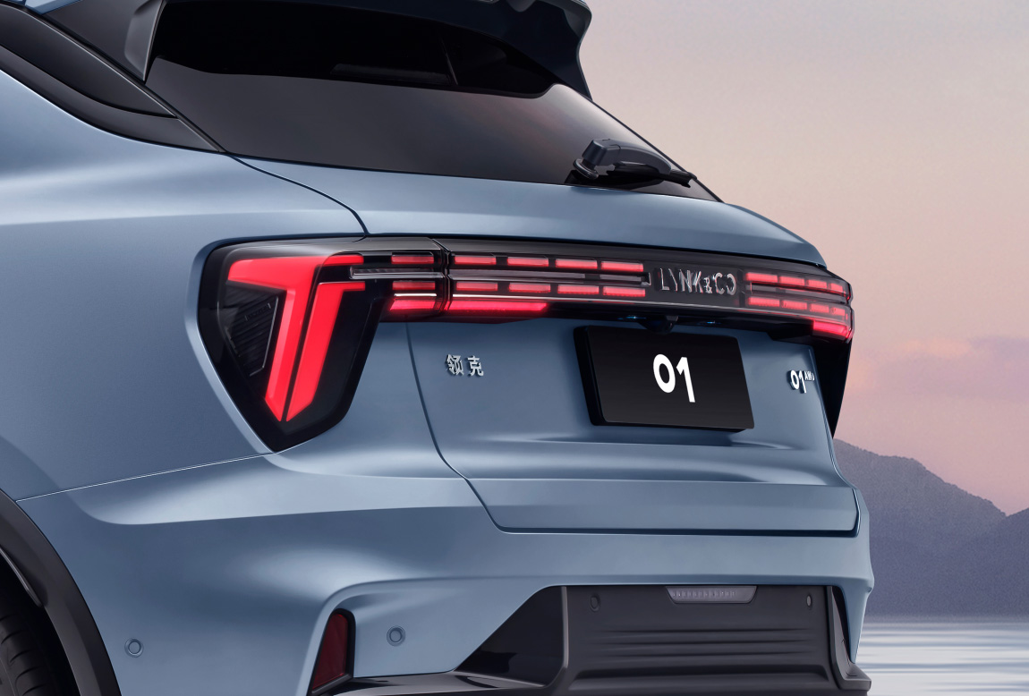 车身侧面,整车得到姿态线条设计动态且饱满,悬浮式的车顶设计配合车身侧面的平行腰线设计让车侧看起来更具层次,车尾部分则是采用了宽厚的贯穿式尾灯组设计,中间加入了领克自字母表示来提升辨识度,而底部则是设计了梯形的后包围以及双边双出排气,整体感不错。