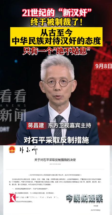 9月8号那天,中国外交部甩出了一条挺重磅的消息,点名制裁日本参议员石平太郎,冻结他在中国的资产,禁止入境,包括香港和澳门。