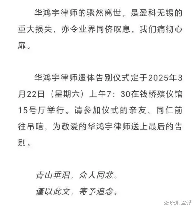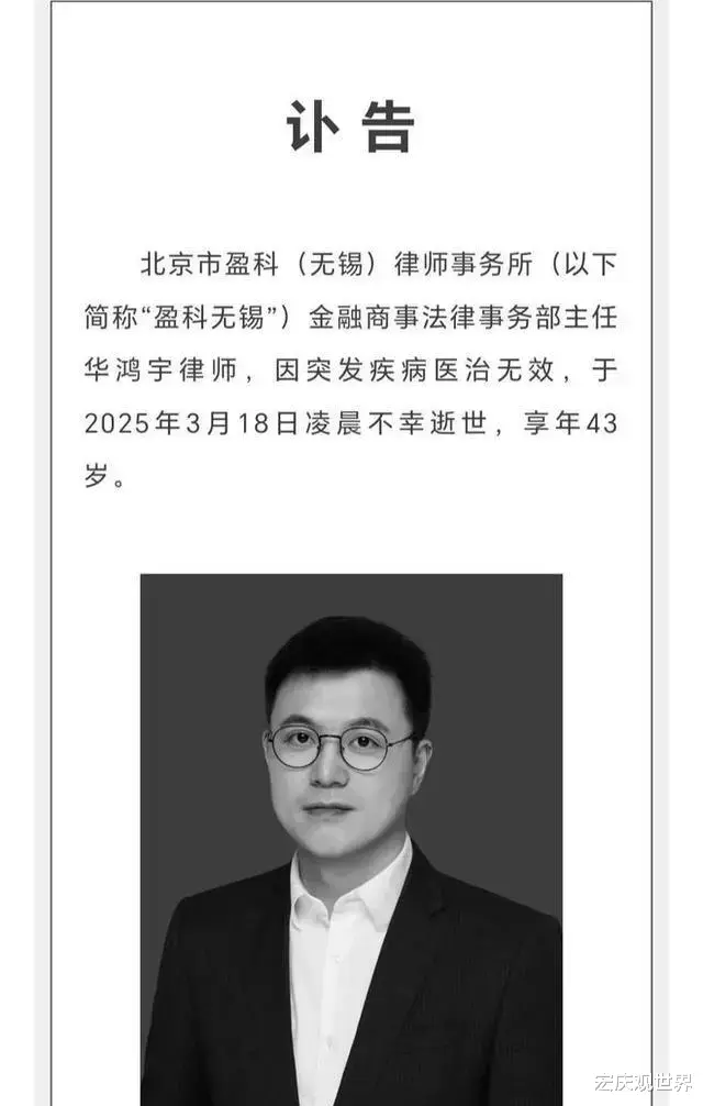 李卉的好友爆料,他是因为突发心脏病去世的。据说,李卉生前看起来没啥异样,但社交平台上的一些细节却暴露了问题。他经常熬夜、喝酒,还胡吃海喝,身材偏胖,脸色也不太好。有网友调侃说,李卉的社交平台简直就是“深夜食堂”现场,酒肉满桌,看得人直担心他的健康。李卉也知道自己身体有点问题,还做过体检,但就是没把健康当回事。这事儿也提醒了大家,50多岁的人可得格外注意饮食和作息,不然很容易患上三高。而华鸿宇的离世更是让人意外。他是在凌晨突发疾病去世的,同事们都没反应过来,白天还一起讨论案子,晚上就天人永隔。大家都猜测,高强度的工作和巨大的压力可能是导致他突发疾病的原因。律所的同事们也发文呼吁,希望大家能重视健康,别只顾着工作,把身体给累垮了。