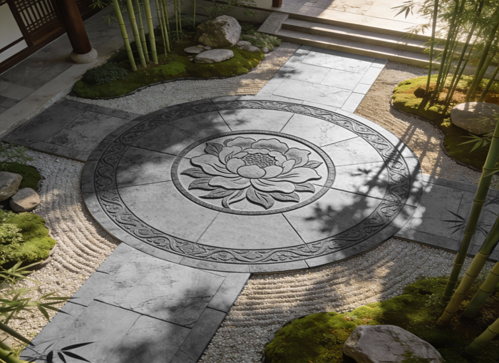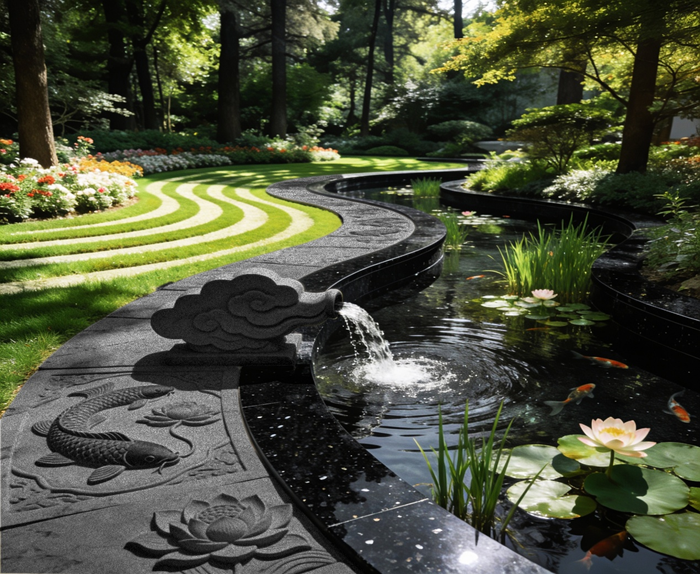 其二,功能优先与生态友好原则。景观庭院的核心功能是满足人们的休憩、观赏、社交需求,吉祥图案的运用不能脱离功能空谈文化,更不能破坏生态平衡与风水气场。例如,在步道设计中运用祥云图案时,我们会选用防滑、透水的本地石材进行铺装,确保行走安全与雨水渗透,契合“排水防潮、藏风聚气”的风水口诀;在水景设计中融入锦鲤图案时,会优先构建完善的水体生态循环系统,搭配水生植物净化水质,再通过驳岸雕刻或实景养殖实现图案寓意,而非单纯追求视觉效果。