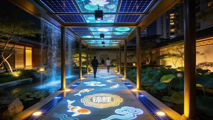 其二,科技融合与低碳创新。我们结合现代低碳科技手段,如太阳能灯光、智能数控、投影、雨水感应等,让吉祥图案呈现出动态的视觉效果,同时降低能源消耗。例如,在香港某高端庭院项目中,我们在荷花廊顶棚安装太阳能玻璃和感应投影设备,夜晚通过太阳能供电将动态的锦鲤、祥云图案投影在地面,配合水流声、轻音乐,营造出沉浸式的景观体验;在步道上安装太阳能感应灯光,当人们行走时,灯光呈现出吉祥图案的轨迹,增强了互动性与趣味性,而太阳能的使用实现了能源的清洁可持续。