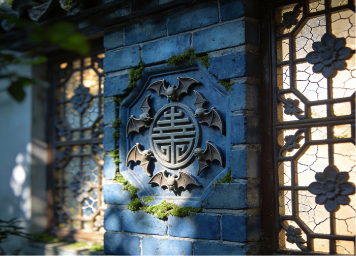 首先是建筑类元素,如景墙、门洞、窗花等。景墙是庭院的视觉焦点之一,我们多采用生态材料与工艺呈现吉祥图案,如在重庆某庭院入口景墙上,采用镂空青砖雕刻“五福临门”图案(五只蝙蝠围绕寿字),青砖透气透水,砖缝间可生长苔藓,既起到遮挡视线、划分空间的作用,又传递出欢迎宾客、祈福纳祥的寓意,同时提升了墙体的生态透气性;门洞和窗棂可采用“海棠纹”“冰裂纹”“如意纹”等图案造型,通过漏景的手法让庭院内外景观相互渗透,营造“虚实相生”的意境,其中“海棠纹”象征“富贵满堂”,“冰裂纹”象征“岁岁平安”,丰富了空间的文化内涵。