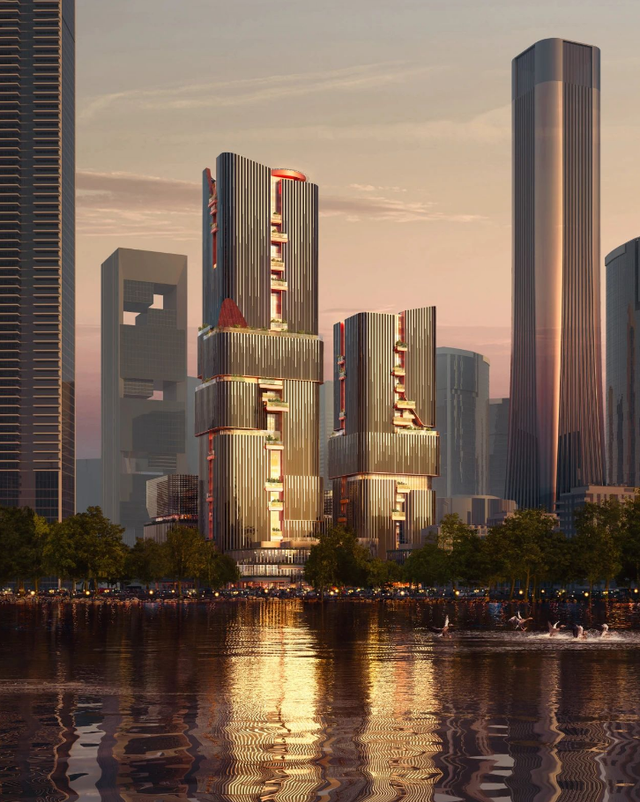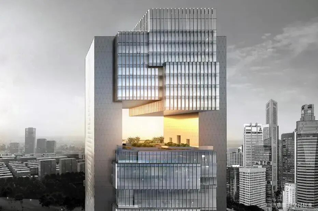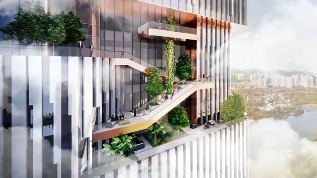 建筑由奥雷·舍人设计,以“画境之城”为理念,融汇中国传统山水意境与岭南文化。外观以瀑布式垂直百叶为特色,兼顾视觉美感与智能通风遮阳功能,并通过空中花园、立体中庭等媒介空间,营造生态友好、宜人交流的办公环境。